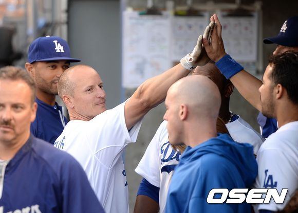 12일(이하 한국시간) 미국 캘리포니아주 로스앤젤레스 다저스타디움에서 열린 2013 메이저리그 LA 다저스와 탬파베이 레이스의 경기, 7회말 1사 1루에서 다저스 엘리스가 좌월 투런 홈런을 치고 덕아웃에서 동료들의 축하를 받고 있다.