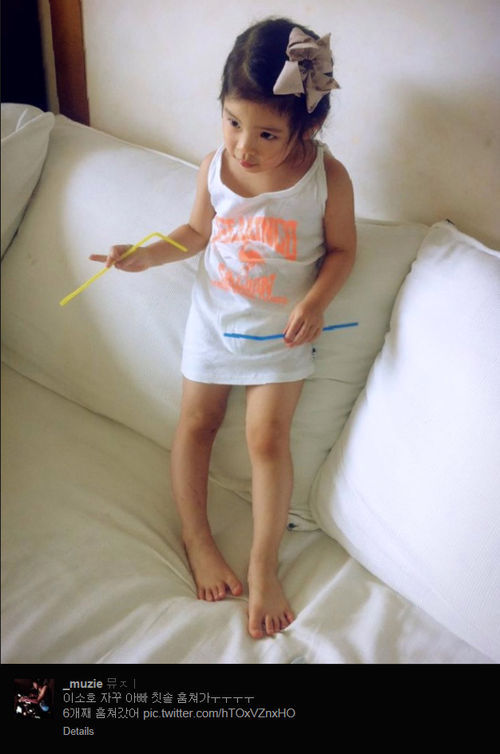 가수 UV의 멤버 뮤지가 자신의 딸 사진을 공개해 관심을 모으고 있다. 뮤지는 지난 11일 자신의 트위터를 통해 "이소호 자꾸 아빠 칫솔 훔쳐가ㅜㅜㅜㅜ 6개째 훔쳐갔어"라며 사진 한 장을 올렸다. 사진 속에는 뮤지의 딸 이소호 양이 쇼파 위에서 서서 빨대를 들고 있다.