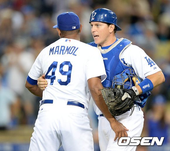 경기 종료 후 다저스 마몰과 포수 엘리스가 승리의 환호를 하고 있다. /sunday@osen.co.kr