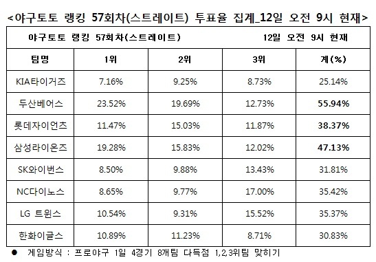 국민체육진흥공단(www.kspo.or.kr)이 발행하는 체육진흥투표권 수탁사업자인 스포츠토토 공식발매사이트인 베트맨(www.betman.co.kr)은 오는 13일에 개최되는 두산-롯데, SK-KIA, 삼성-LG, 한화-NC 등 4경기 8개팀을 대상으로 한 야구토토 랭킹 57회차 스트레이트 게임 중간집계결과 두산(55.94%), 삼성(47.13%), 롯데(38.37%)을 차례로 다득점 상위 3개팀으로 꼽았다고 밝혔다. 반면 한화(30.83), KIA(25.14%)는 가장 적은 득점을 기록할 것으로 예상했다.