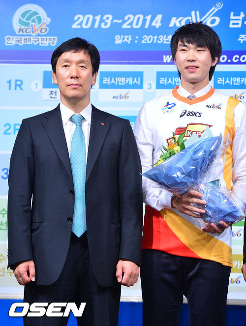 12일 오후 서울 청담동 리베라호텔 베르사유홀에서 열린 2013-14시즌 남자 신인선수 드래프트에서 KEPCO 신영철 감독이 1라운드 1순위 전광인을 지명, 함께 포토타임을 갖고 있다.