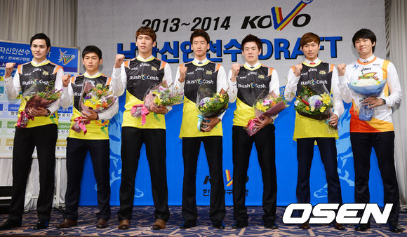 12일 오후 서울 청담동 리베라호텔 베르사유홀에서 열린 2013-14시즌 남자 신인선수 드래프트에서 오른쪽부터 1라운드 1순위 KEPCO 전광인과 2순위 러시앤캐시 이민규, 3순위 송희채 4순위 송명근 5순위 김규민 6순위 정성현 7순위 심경섭이 포토타임을 갖고 있다.
