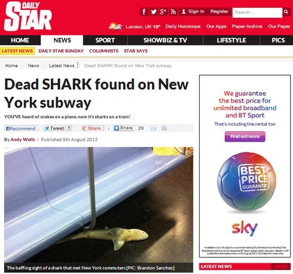 데일리 스타 등 영국, 미국 언론들은 목격자와 뉴욕 지하철 운영을 맡고 있는 MTA 대변인의 말을 인용, 지난주 놀라운 소식 중 하나로 죽은 상어가 뉴욕 지하철에서 발견된 사실을 전했다.