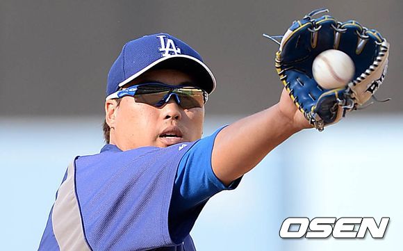 13일(이하 한국시간) 미국 캘리포니아주 로스앤젤레스 다저스타디움에서 열린 2013 메이저리그 LA 다저스와 뉴욕 메츠의 경기, 경기에 앞서 다저스 류현진이 수비 훈련을 하고 있다.