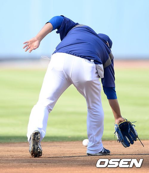 13일(이하 한국시간) 미국 캘리포니아주 로스앤젤레스 다저스타디움에서 열린 2013 메이저리그 LA 다저스와 뉴욕 메츠의 경기, 경기에 앞서 다저스 류현진이 수비 훈련을 하고 있다.