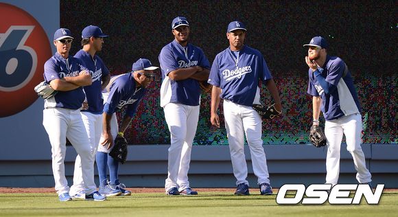 13일(이하 한국시간) 미국 캘리포니아주 로스앤젤레스 다저스타디움에서 열린 2013 메이저리그 LA 다저스와 뉴욕 메츠의 경기, 경기에 앞서 다저스 투수진이 훈련 중 이야기를 나누고 있다.