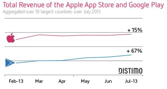 디스티모의 조사에 따르면 올 2월부터 7월까지 6개월 동안 구글 플레이스토어의 수익률은 67%나 성장했지만 15%의 성장률을 보인 애플 앱스토어를 따라가지는 못했다.