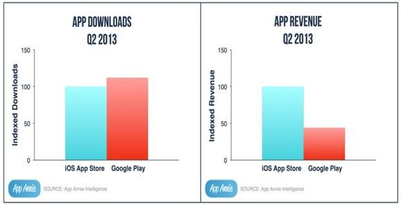 지난 1일 앱 애니라는 업체의 조사 결과도 이와 비슷한 양상을 보였다. 올 상반기에 어플리케이션 다운로드 수는 구글 플레이가 더 높았지만 수익에서는 애플 앱스토어가 2.3배 높은 것으로 나타났다.