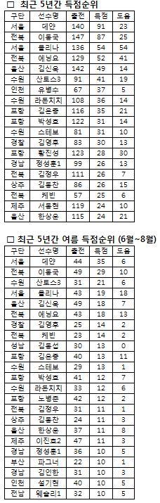 여름에 가장 강한 미스터 썸머(Mr. Summer)는 데얀(서울)이다. 데얀은 최근 5년간 6월부터 8월 사이에 44경기에 출전해 35골 6도움을 기록했다. 데얀은 최근 5년간 총 91골 중 38.5%를 여름 기간에 득점했다. 이동국(전북, 29골 10도움), 산토스(수원, 21골 6도움), 몰리나(서울(19골 18도움), 김신욱(울산, 18골 7도움)도 여름에 강한 면모를 과시했다.