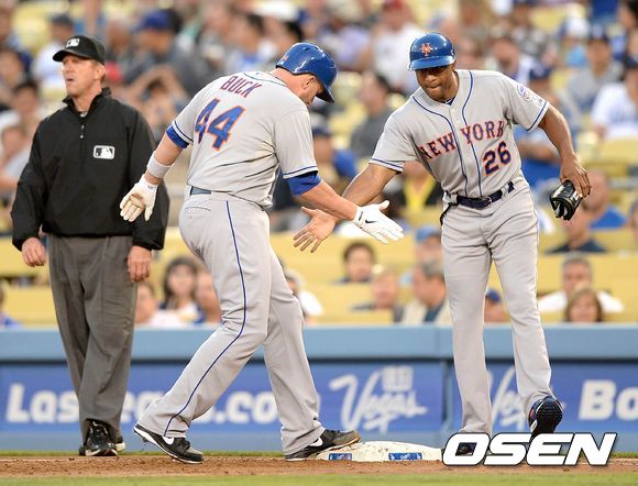 13일(이하 한국시간) 미국 캘리포니아주 로스앤젤레스 다저스타디움에서 열린 2013 메이저리그 LA 다저스와 뉴욕 메츠의 경기, 2회초 무사 1,2루에서 메츠 벅이 중전 적시타를 치고 환호하고 있다.