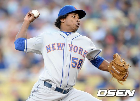 13일(이하 한국시간) 미국 캘리포니아주 로스앤젤레스 다저스타디움에서 열린 2013 메이저리그 LA 다저스와 뉴욕 메츠의 경기, 1회말 무사에서 메츠 선발투수 헨리 메히아가 힘차게 공을 던지고 있다.
