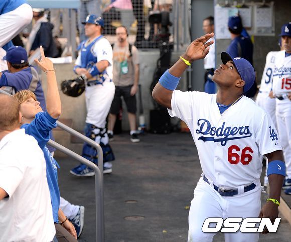 13일(이하 한국시간) 미국 캘리포니아주 로스앤젤레스 다저스타디움에서 열린 2013 메이저리그 LA 다저스와 뉴욕 메츠의 경기, 경기에 앞서 다저스 푸이그가 팀관계자와 세레모니를 펼치고 있다.