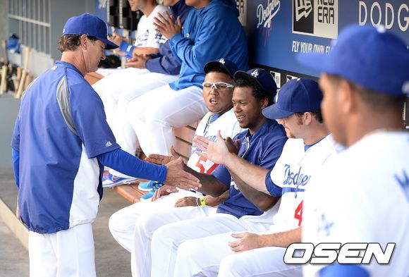 13일(이하 한국시간) 미국 캘리포니아주 로스앤젤레스 다저스타디움에서 열린 2013 메이저리그 LA 다저스와 뉴욕 메츠의 경기, 경기에 앞서 다저스 매팅리 감독이 선수들과 하이파이브를 하고 있다.
