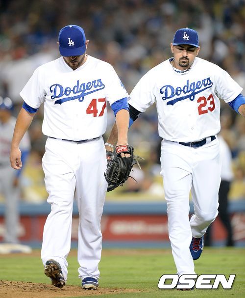 13일(이하 한국시간) 미국 캘리포니아주 로스앤젤레스 다저스타디움에서 열린 2013 메이저리그 LA 다저스와 뉴욕 메츠의 경기, 6회초 2사에서 다저스 곤살레스가 메츠 플로레스의 땅볼 타구를 직접 잡아 처리하고 덕아웃을 향하는 놀라스코를 격려하고 있다.