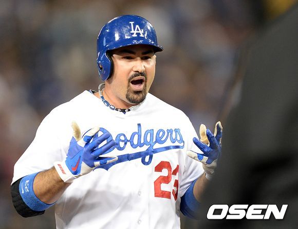 13일(이하 한국시간) 미국 캘리포니아주 로스앤젤레스 다저스타디움에서 열린 2013 메이저리그 LA 다저스와 뉴욕 메츠의 경기, 6회말 무사 1,2루에서 다저스 곤살레스가 좌전 적시타를 치고 환호하고 있다.