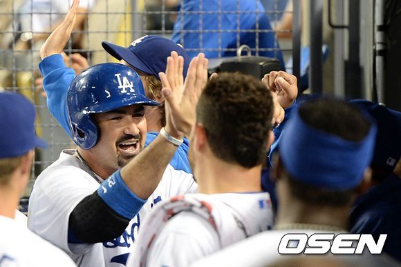 13일(이하 한국시간) 미국 캘리포니아주 로스앤젤레스 다저스타디움에서 열린 2013 메이저리그 LA 다저스와 뉴욕 메츠의 경기, 6회말 무사 3루에서 다저스 푸이그의 희생플라이때 홈을 밟은 3루주자 곤살레스가 덕아웃에서 동료들과 환호하고 있다.