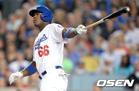 13일(이하 한국시간) 미국 캘리포니아주 로스앤젤레스 다저스타디움에서 열린 2013 메이저리그 LA 다저스와 뉴욕 메츠의 경기, 6회말 무사 3루에서 다저스 푸이그가 희생플라이를 날리고 있다.