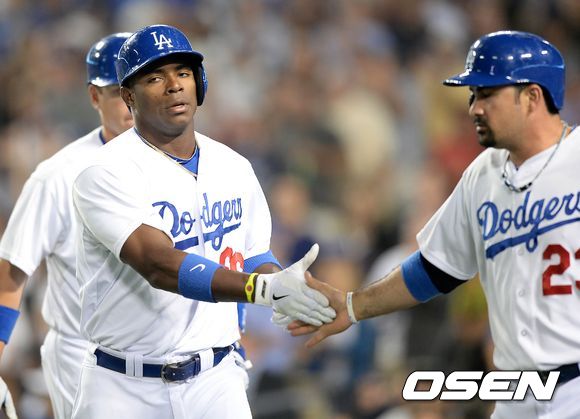 13일(이하 한국시간) 미국 캘리포니아주 로스앤젤레스 다저스타디움에서 열린 2013 메이저리그 LA 다저스와 뉴욕 메츠의 경기, 6회말 무사 3루에서 다저스 푸이그가 희생플라이를 날리고 홈을 밟은 3루주자 곤살레스와 환호하고 있다.