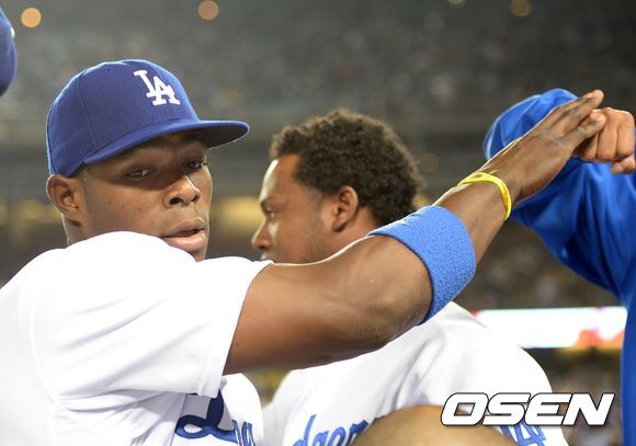 13일(이하 한국시간) 미국 캘리포니아주 로스앤젤레스 다저스타디움에서 열린 2013 메이저리그 LA 다저스와 뉴욕 메츠의 경기, 7회초 2사 2,3루에서 다저스 푸이그가 메츠 머피의 타구를 처리하고 덕아웃에서 동료들과 환호하고 있다.