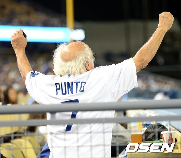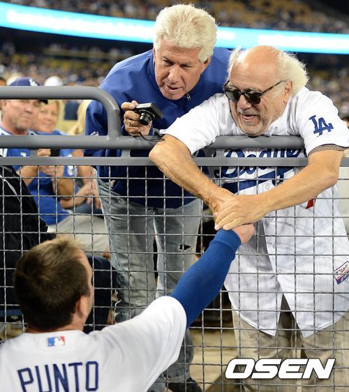 13일(이하 한국시간) 미국 캘리포니아주 로스앤젤레스 다저스타디움에서 열린 2013 메이저리그 LA 다저스와 뉴욕 메츠의 경기, 7회말 1사에서 다저스 푼토가 솔로 홈런을 치고 자신의 팬임을 자처하는 영화배우 대니 드비토와 악수를 나누고 있다.