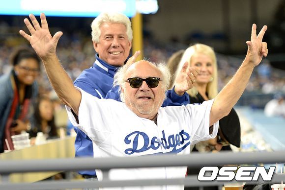 13일(이하 한국시간) 미국 캘리포니아주 로스앤젤레스 다저스타디움에서 열린 2013 메이저리그 LA 다저스와 뉴욕 메츠의 경기, 7회말 1사에서 다저스 푼토의 솔로 홈런 때 푼토의 팬 영화배우 대니 드비토가 관중석에서 환호하고 있다.