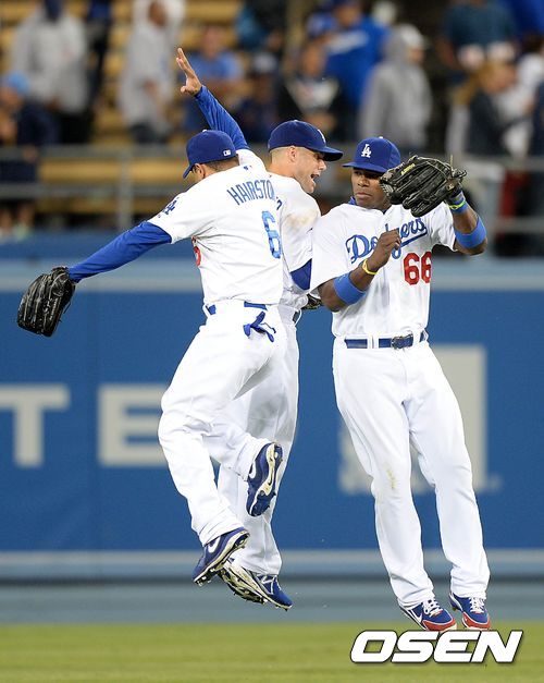 경기 종료 후 다저스 헤어스턴, 슈마커, 푸이그가 승리의 기쁨은 나누고 있다. /sunday@osen.co.kr