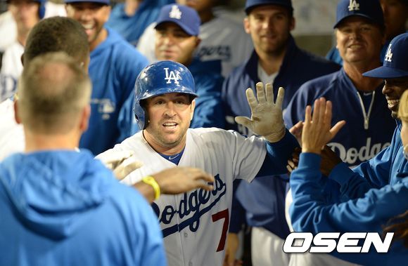 7회말 1사에서 솔로 홈런을 친 다저스 푼토가 동료들과 환호하고 있다. /sunday@osen.co.kr