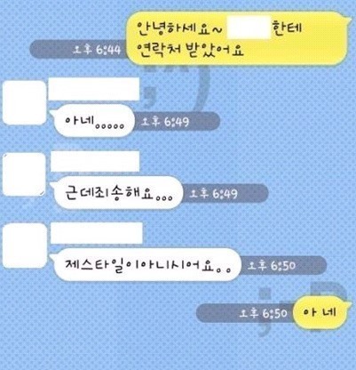 먼저 한 사람이 "안녕하세요~ OOO한테 연락처 받았어요"라고 말을 건네자, 상대방은 "아 네..."라며 "그런데 죄송해요... 제 스타일이 아니시네요.."라고 거절 의사를 즉시 밝혔다. 이에 처음 말을 건넨 이는 "아 네"라고 답했다.