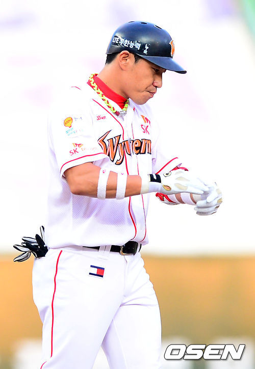 13일 오후 인천 문학구장에서 열린 SK 와이번스와 KIA 타이거즈의 경기, 1회말 1사 주자 만루 SK 김강민이 좌익수 왼쪽 역전 3타점 적시타를 날린 후 박수를 치고 있다.