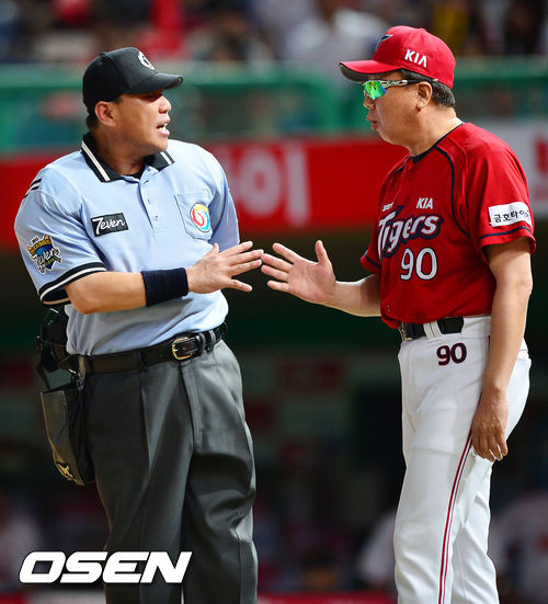 13일 오후 인천 문학구장에서 열린 SK 와이번스와 KIA 타이거즈의 경기, 7회초 1사 주자 1루 KIA 이용규가 타석에서 삼진아웃을 당하자 KIA 선동렬 감독이 임채섭 구심에게 항의를 하고 있다.