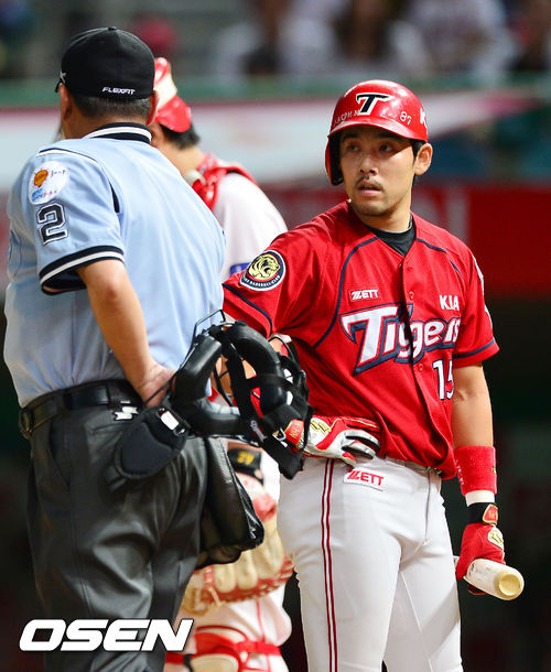 13일 오후 인천 문학구장에서 열린 SK 와이번스와 KIA 타이거즈의 경기, 7회초 1사 주자 1루 KIA 이용규가 타석에서 삼진아웃을 당하자 이용규가 마지막 볼이 파울 볼이 아니냐며 임채섭 구심에게 항의를 하고 있다.