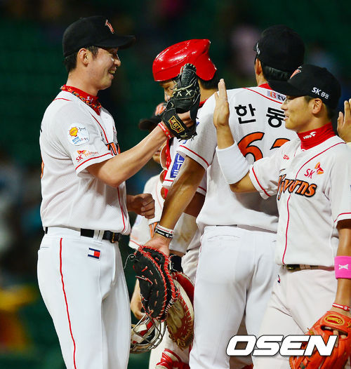 경기를 마치고 SK 진해수가 동료들과 하이파이브를 하고 있다. / rumi@osen.co.kr