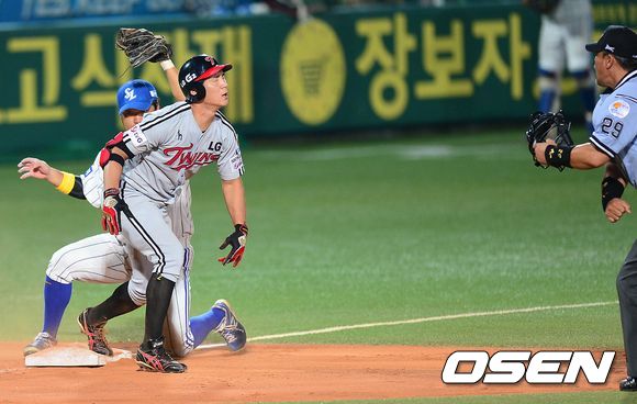 8회초 LG 공격 1사 2루 상황 9번타자 오지환이 1타점 중견수 키를 넘는 2루타를 날리고 3루까지 내달리다 삼성 3루수 박석민의 태그에 걸려 아웃된 뒤 아쉬워하고 있다.