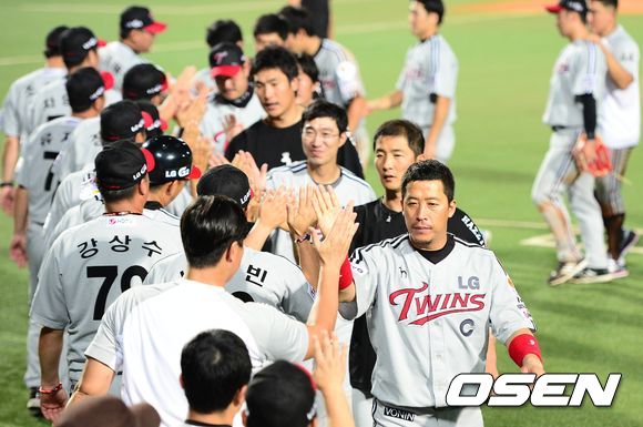 승리를 거둔 LG 선수들이 하이파이브를 나누고 있다.
