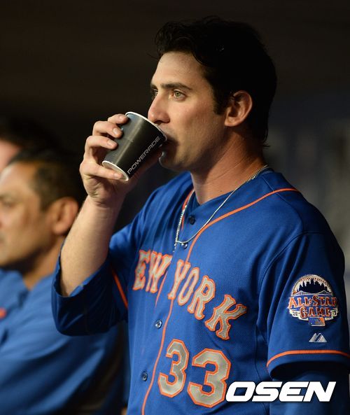 14일(이하 한국시간) 미국 캘리포니아주 로스앤젤레스 다저스타디움에서 열린 2013 메이저리그 LA 다저스와 뉴욕 메츠의 경기, 1회말 수비를 마친 메츠 맷 하비가 더그아웃에서 경기를 지켜보고 있다.