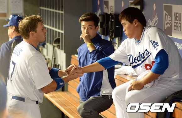 14일(이하 한국시간) 미국 캘리포니아주 로스앤젤레스 다저스타디움에서 열린 2013 메이저리그 LA 다저스와 뉴욕 메츠의 경기, 7회초 수비를 마치고 다저스 류현진이 엘리스와 이야기를 나누고 있다.