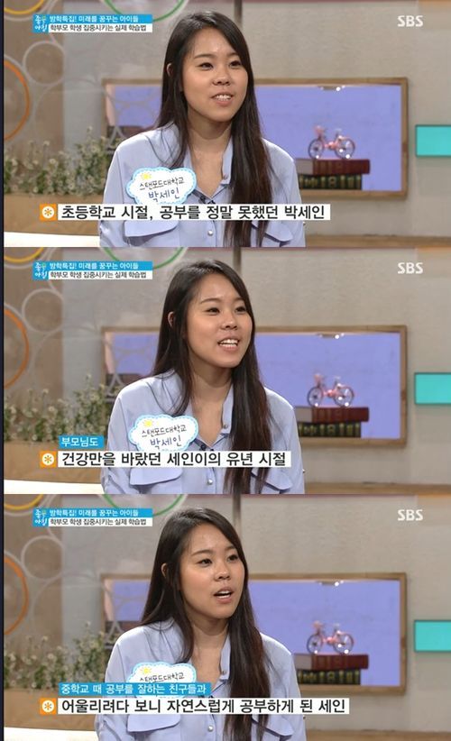 박세인 양은 “초등학교 때 공부 정말 못했다. 성적표에는 성격 좋다는 말밖에 없었다. 그래서 집에서는 ‘건강하게만 자라다오’라고 했다”며 “공부에 흥미도 없었다. 이후 공부를 하다보니까 기대감이 올라갔다. 솔직히 그 전까지는 공부에 흥미가 없었다”고 털어놓았다.