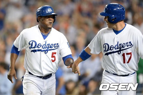 5회말 1사 1,3루에서 다저스 닉 푼토의 역전 2타점 좌전 적시 2루타에 홈을 밟은 유리베, 앨리스가 하이파이브를 하며 기뻐하고 있다. /sunday@osen.co.kr