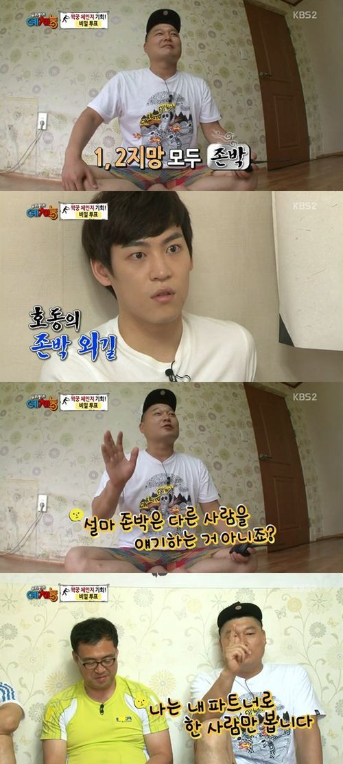 이에 존박은 초조해 하는 모습을 보였고 멤버들이 있는 방으로 돌아온 강호동은 “상대도 나여야 하는 거지 쓸데없이 다른 사람을 부르면 안된다”며 “내 파트너로 한사람만 봅니다. 그게 어긋났을 때 한사람만 팹니다”라고 격한 애정표현에 멤버들의 웃음을 자아냈다.