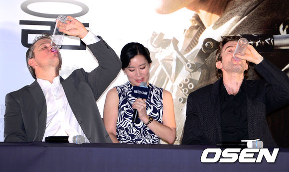 14일 오후 서울 여의도 CGV에서 열린 영화 '엘리시움' GV상영회에서 배우 맷 데이먼과 샬토 코플리가 물을 마시고 있다.