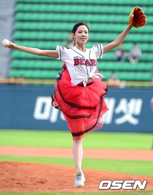 14일 오후 서울 잠실야구장에서 열린 '2013 한국야쿠르트 세븐 프로야구' 두산 베어스와 롯데 자이언츠의 경기, 경기에 앞서 시구자로 나선 이은원 국립발레단 수석발레리나가 튜튜스커트를 입고 발레 동작을 선보이고 있다.