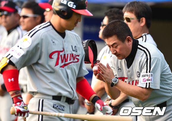LG 김기태 감독이 경기 시작을 앞두고 삼성 벤치를 향해 미안함의 뜻을 담은 인사를 하고 있다. 어제(14일) 경기에서 삼성과 LG는 조동찬과 문선재가 1루에서 충돌, 조동찬이 무릎 부상을 입는 불의의 사고를 당했다.