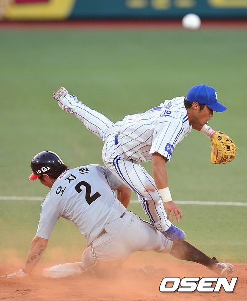 2회초 LG 공격 1사 1루 상황 8번타자 김재민의 내야 땅볼 때 삼성 2루수 김태완이 주자 오지환을 포스아웃 시킨 뒤 1루를 향해 송구하고 있다. 주자 오지환과 충돌해 넘어지고 있는 김태완.