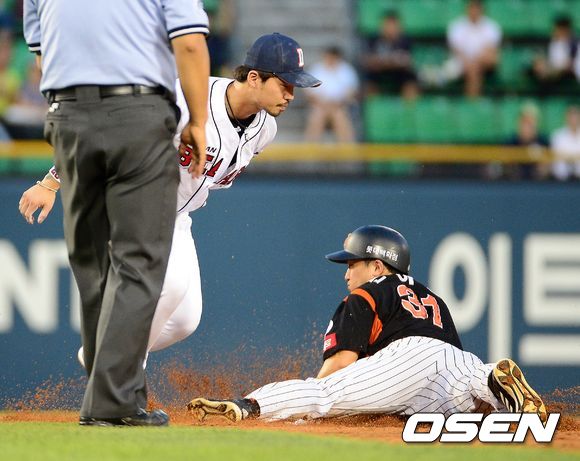14일 오후 서울 잠실야구장에서 열린 '2013 한국야쿠르트 세븐 프로야구' 두산 베어스와 롯데 자이언츠의 경기, 3회초 2사 1루 롯데 전준우 타석에 손아섭이 두산 오재원의 태그에 앞서 2루 도루에 성공하고 있다.