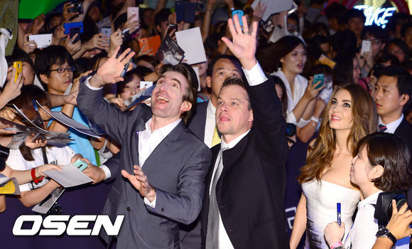14일 오후 서울 여의도 CGV에서 열린 영화 '엘리시움' 레드카펫행사에서 배우 맷 데이먼과 살토 코플리가 팬들에게 인사를 하고 있다.