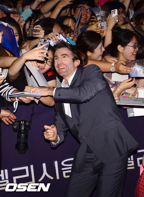 14일 오후 서울 여의도 CGV에서 열린 영화 '엘리시움' 레드카펫행사에서 배우 샬토 코플리가 팬들과 함께 폰 사진을 찍고 있다