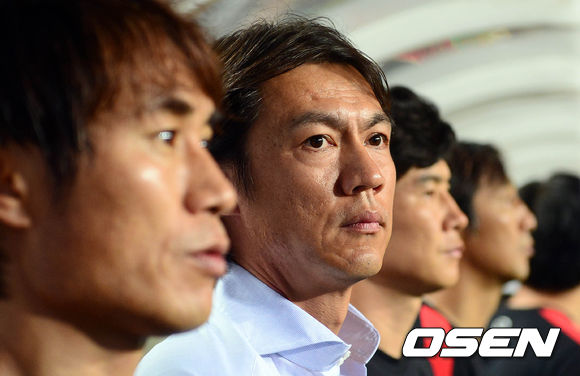 14일 오후 수원 월드컵경기장에서 열린 한국과 페루의 평가전 시작 전 홍명보 감독이 벤치에서 그라운드를 바라보고 있다.