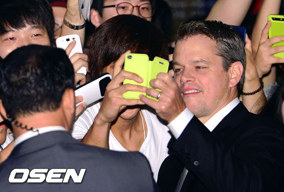 14일 오후 서울 여의도 CGV에서 열린 영화 '엘리시움' 레드카펫행사에서 배우 맷 데이먼이 팬들과 폰 사진을 찍고 있다