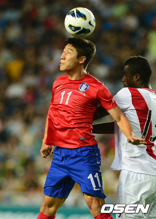 14일 오후 수원 월드컵경기장에서 열린 한국과 페루의 평가전 전반 이근호가 공중볼 다툼을 하고 있다.
