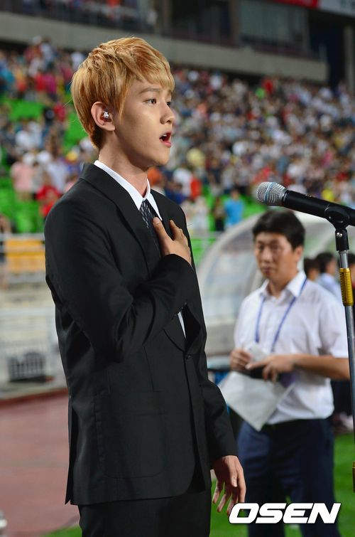 14일 오후 수원 월드컵경기장에서 열린 한국과 페루의 평가전 시작 전 엑소(EXO) 백현이 애국가를 부르고 있다.